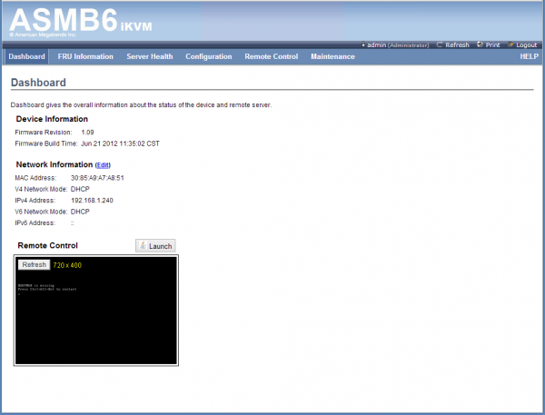 After logging in, one is sent to the dashboard. I would generally recommend IE or Firefox with MegaRAC solutions.