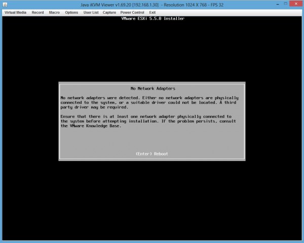 The resulting ISO can be burned to a CD, or easier may be using the onboard IPMI capability to remotely mount the ISO. Once this is complete, the ESXi 5.5 installer will pass the “No Network Adapters” warning and instead allow one to choose an installation drive.