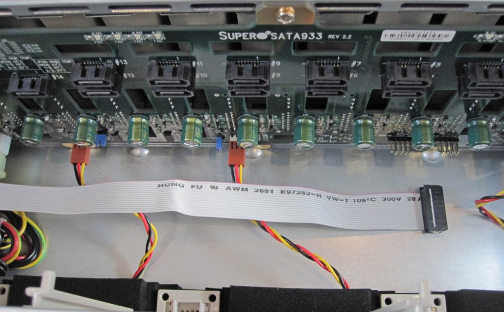 Connecting the fifteen drives are backplane headers that are familiar to most computer users, the simple SAS/ SATA connector. Some users, especially those of the Areca 12xx series of RAID controllers will be able to directly connect individual SATA cables to be backplane which does save some cost over SFF-8088 and SFF-8087 cables. On the other hand, most users will need SFF-8088 to SFF-8087 connectors to connect the SC933T-R760B’s backplane to their SAS/ SATA controllers. I prefer backplanes with SFF-8088 connectors due to the clean and simple installation, however using SFF-8087 cables is not necessarily a negative.