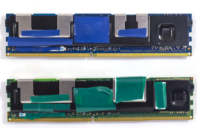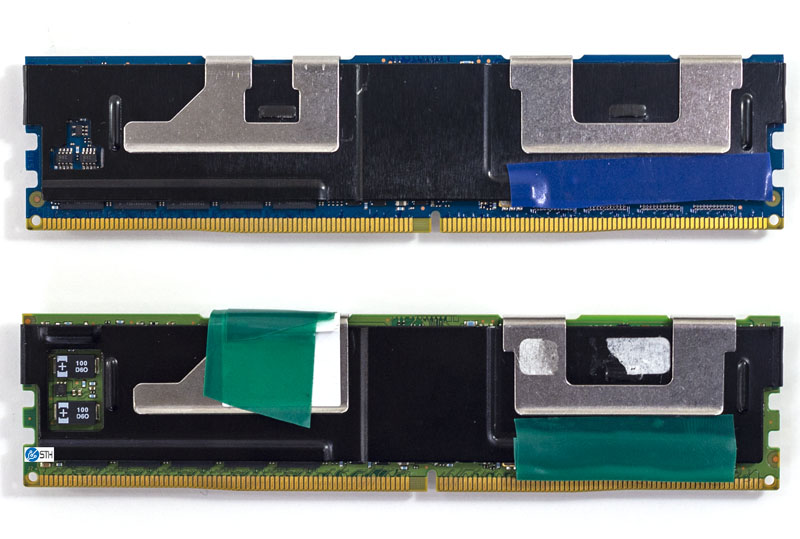 Here is a view of the blue PCB Intel Optane DC Persistent Memory DIMM along with the green Apache Pass module. You will see that we had to pull a firmware sticker to get front and back views. We also taped the green module in green electrical tape just to keep descriptions easy.