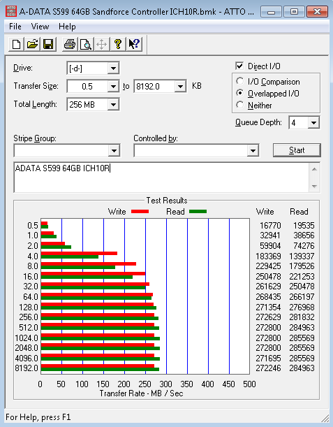 This is how manufacturers claim 285MB/s read 275MB/s write speeds to Sandforce based drives. The ATTO benchmark basically uses highly compressible data to stream to the disk. Since Sandforce controllers compress data before writing it to flash, this is basically a best case benchmark. I will note though that every Sandforce drive I have seen in the 120GB and 60GB capacities have managed the advertised read/write speeds. The badness is that those advertised figures are really only applicable in synthetic tests, or more specifically, A synthetic test (ATTO).