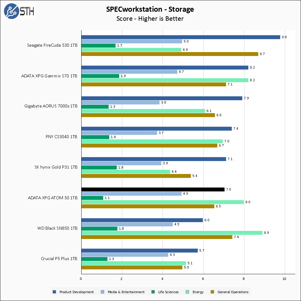 SPECworkstation performance is fine for the ADATA XPG ATOM 50 1TB. Only the Life Sciences score stands out as particularly low, while some of the other tests like Energy place the ATOM 50 in the top 3.