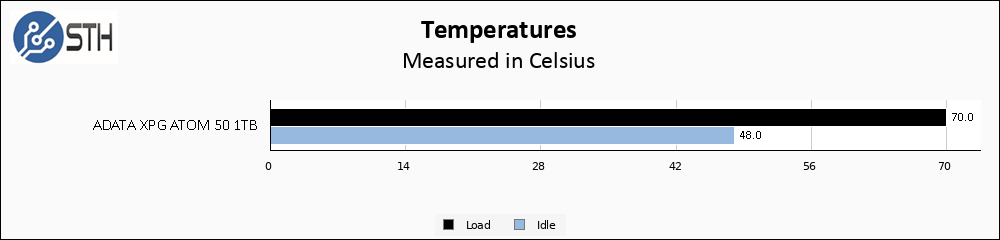 The ADATA XPG ATOM 50 comes with a thin metal heat spreader, which I kept attached during all testing. I did not perform testing without the heat spreader, so I cannot say how effective it is. But with it attached the XPG ATOM 50 managed to peak at 70C, which is the exact end of my comfort zone for SSDs. In a cramped or low-airflow chassis, the ATOM 50 may need more help than its tiny heat spreader can provide, but for most users, it should be fine.