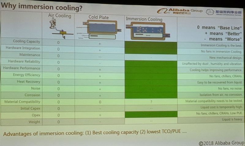 The reasons for Alibaba’s immersion cooling project were to increase efficiency. Cooling is a major data center cost so increasing efficiency has a direct impact on TCO.