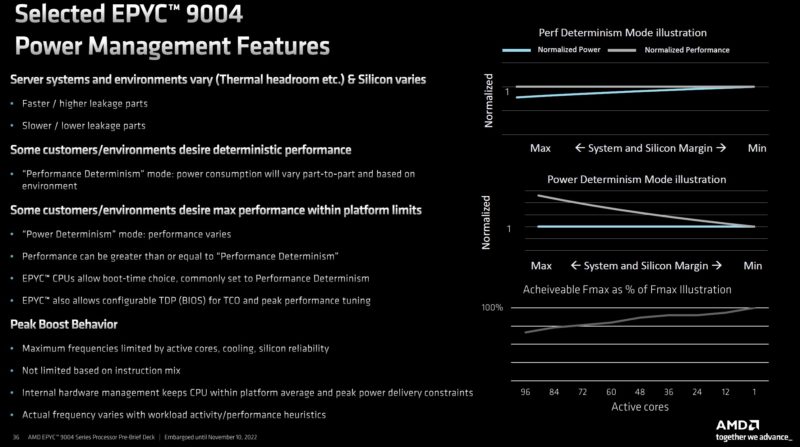 AMD also has new power management features. Something that many do not know you can do on AMD platforms is set performance or power-focused profiles. In performance determinism mode, performance is maintained across all chips. This is standard and what you see most benchmarks on. In power determinism mode, one gets to play the “silicon lottery” a bit and set a power level and let the EPYC chips in a system run at whatever performance level they can achieve. We did not get to play with this as much as we wanted but in about 30 minutes running a few workloads we were able to eke out about 2% better performance but also with a bit higher overall power consumption (~50W) using power determinism. That is not going to make the main piece because we did not have time to really profile that result, but it seemed to be clearly doing something.
