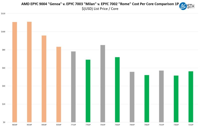 AMD is generally moving its price per core up in this generation. We do not know AMD’s exact pricing methodology, but it seems like AMD is trying to capture the value of having more cores and more performance per core in this generation.
