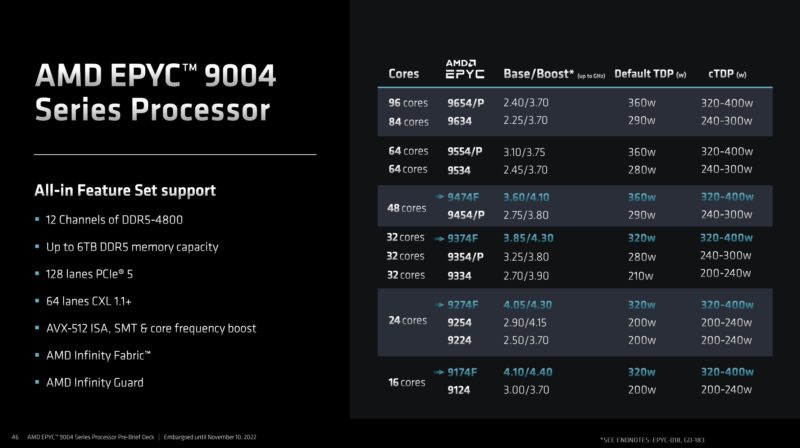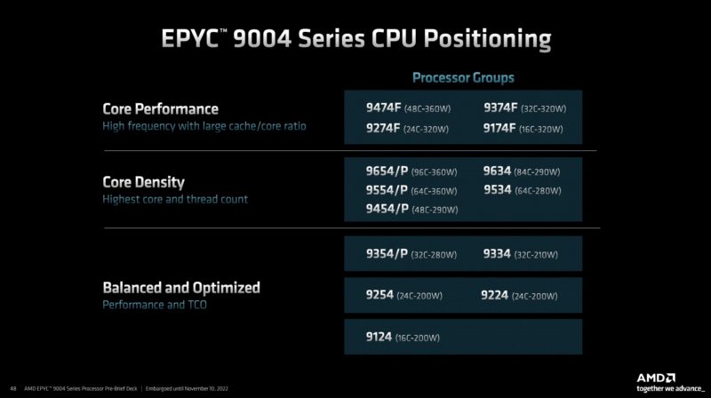 With these, AMD has the four “F” SKUs for frequency-optimized parts at 16, 24, 32, and 48 core increments. There are five lower core count SKUs with one P variant at 32 cores. Finally, there are density-optimized SKUs with five models plus three P variants. It is somewhat amusing that AMD calls these “Core Density” SKUs since it is also saying we are a few months away from the Bergamo 128 core parts. A 48-core part at that point will not seem like a dense part.
