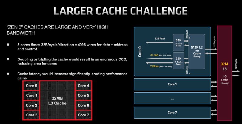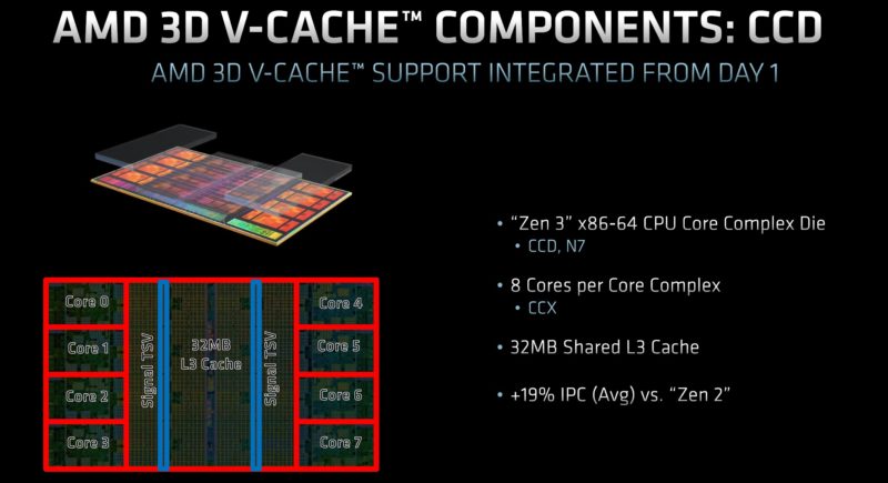 Some commentators are going to cite that there is a very small latency hit just for the clock cycles to go up through the TSV structures to the 64MB cache die. The real-world impact is that the base 32MB of L3 is still present. The additional 64MB of L3 cache is an order of magnitude faster than going out to DDR4 to where the latency is negligible. The real comparison in terms of speed, latency, and power is from on-CCD versus DDR4, not a low single-digit clock cycle hit to access the extra L3.