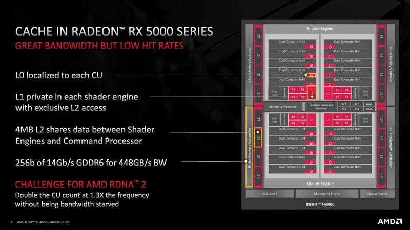 AMD said that they now added a 128MB Infinity Cache to the hierarchy between the 4MB L2 cache and the GDDR6 memory. Something interesting that AMD said is that this cache was inspired by the SRAM that is on the AMD EPYC CPUs. So it seems like RDNA 2 is infused with a little bit of EPYC DNA as well. EPYC had a more efficient and large SRAM cache which is why that became a useful option to bring over to the RDNA 2 design.