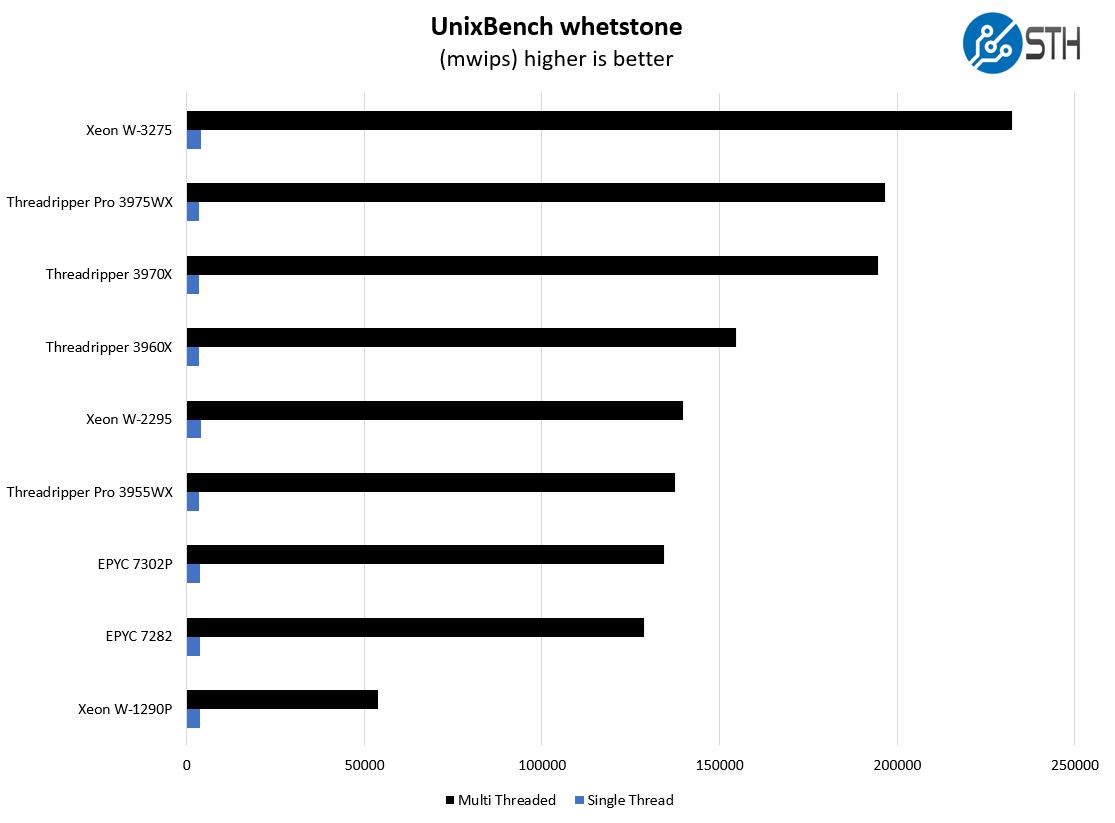 This is an older benchmark that we are not too fond of. Still, we get requests for it. On the whetstone side we see solid performance from the Intel Xeon W-3275, but for the majority of use cases the Threadripper Pro 3975WX will be faster.