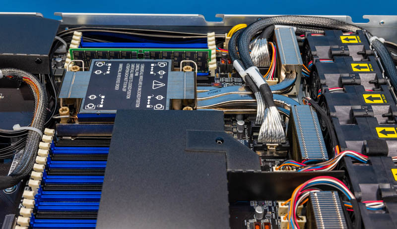 Something else worth calling out is just how many front MCIO PCIe Gen5 connectors there are in front of the Intel Xeon “Sapphire Rapids” CPU sockets. These MCIO connectors are used to provide front-panel PCIe connectivity for NVMe SSDs. In older motherboards, PCIe connectivity was all behind the CPUs and memory. In newer systems, where PCIe Gen5 trace lengths are a challenge, we have a migration for much of the I/O to in front of the CPU sockets creating additional challenges for cooling. Here the cooling solution has to navigate around those front side MCIO headers.