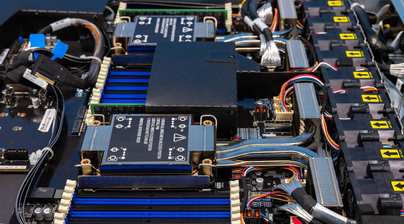The airflow guide keeps air from going through the center 16x DDR5 DIMM slots and instead directs the majority of the airflow through the CPU heatsinks. The platform has a total of 16x DDR5 DIMMs per CPU for 32x total.