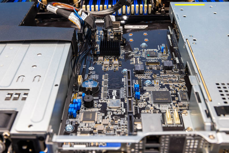 Here is the center section of the system. We can see the PCIe and SATA cables next to the Emmitsburg C741 PCH. We can then see a riser connector in the center along with a microSD card slot and an ASPEED AST2600 BMC.