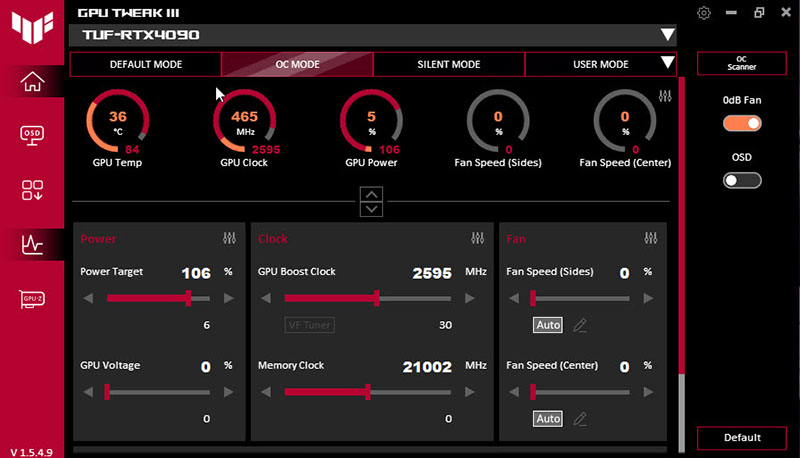 The application software that comes with the ASUS TUF 4090 OC is GPU Tweak III which enables one to click OC on the card or drop it down to silent mode. You can control fan speeds and a whole host of other options. If one wants to control the RGB aspect, then one needs to install Armoury Crate, which also handles updates and many other features related to ASUS products.