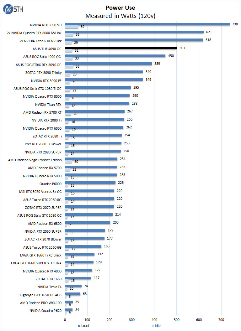 We use the AIDA64 Stress test for our tests, which allows us to stress all aspects of the system. We selected just the GPU for this test and let it run for about 15 minutes. While idle, the ASUS TUF 4090 OC pulls about 18 watts and loads up to about 501 watts. The TUF is about 50 watts higher than the Strix version at max load, but idle power is only at 31 watts. The max power load can go higher with more strenuous applications or with more advanced overclocking.