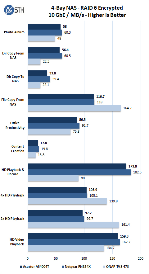 Looking at the 10GbE encrypted results, we again see good numbers compared to higher priced units. The addition of RAID 6 plus encryption shows fewer tests able to break 10GbE speeds. That should be a consideration regarding how you set this unit up.