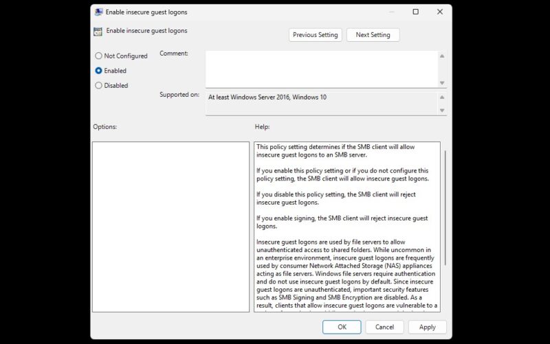 Once there, you can open the menu and click Enabled which allows for connecting to guest logons for SMB shares.