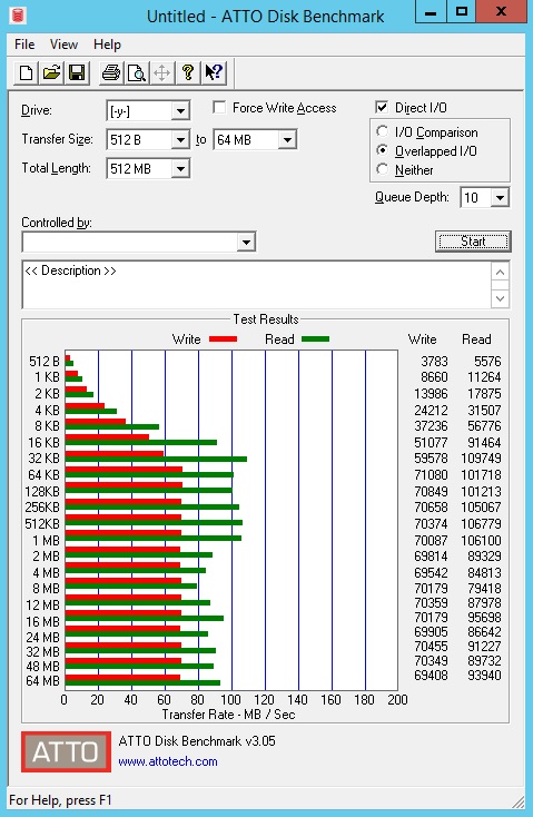 In RAID 0 configuration, we see max transfer rates of 109 MB/s reads and 70 MB/s writes. Writes do cap out at 70 MB/s and Reads bounce around a bit during the benchmarks.