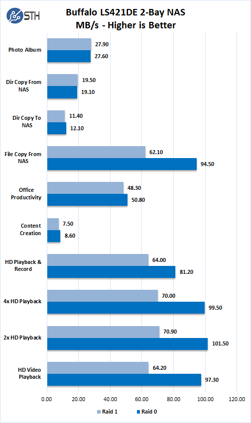 In each of the two different RAID configurations we see solid performance and in some cases exceeded the advertised 80 MB/s performance. RAID 0 does perform better but it seems as though the NAS is not bottlenecked by gigabit LAN speeds.