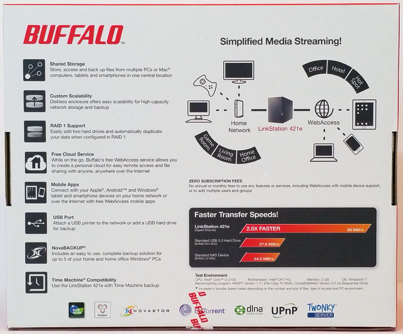 The back also gives more use case scenarios which this NAS box can be used for. We also see a graphic claiming 2.8x Faster Transfer Speeds. We checked that out in the documentations and found this was a comparison to a NAS based on Standard NAS configuration based on a 600 MHz Single Issue ARM processor with 64 MB DDR2 RAM. Our LS421DS is equipped with a processor running at 1.2GHZ and a much large RAM configuration, it is no surprise that performance is that much faster vs a much older model NAS.