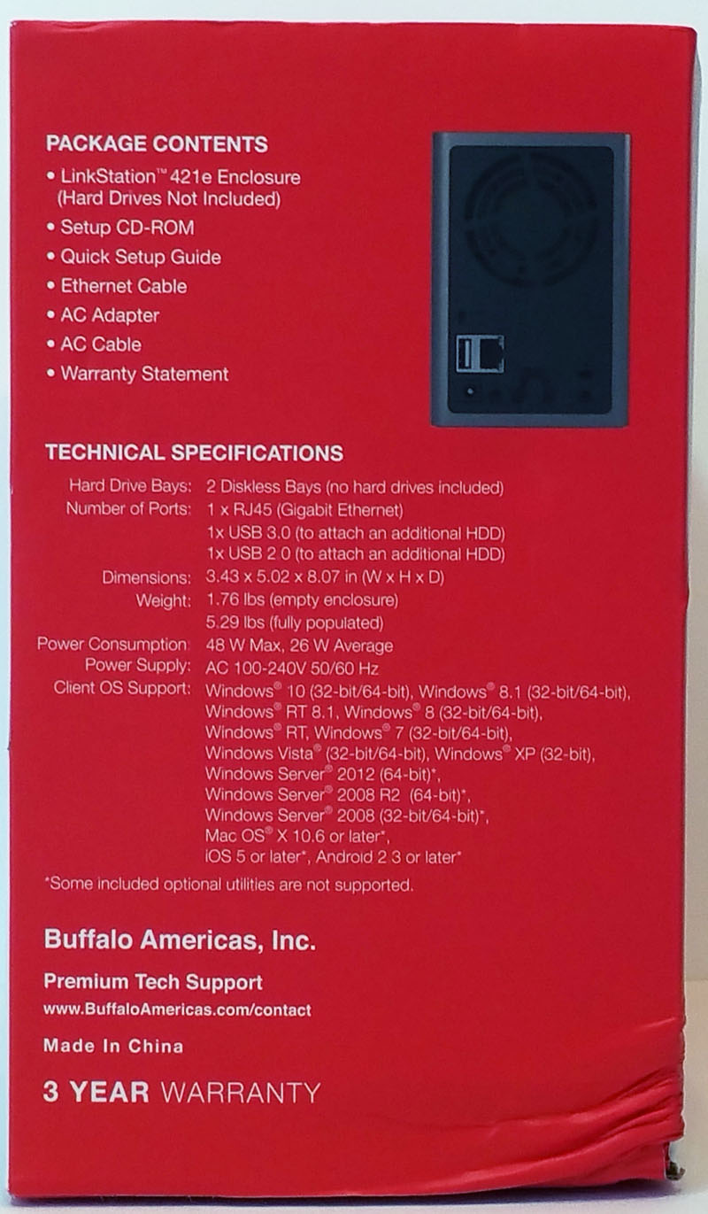 The retail box for the LS421DE gives an overview of features and expected performance which may vary depending on drives used. In our tests, we will see if we can reach the advertised 80 MB/s rating.