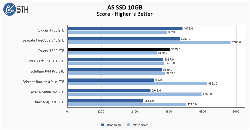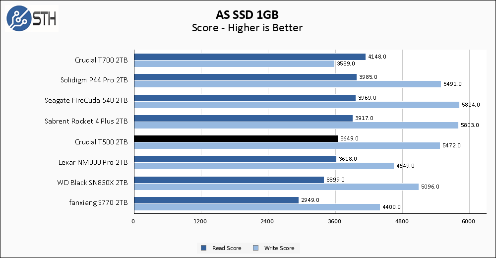 The larger AS SSD allows the Crucial T500 one more chance to acquit itself well in testing, and it does so once again. The T500 can be beaten on write score, but the read score shows it at the top of the Gen4 chart.