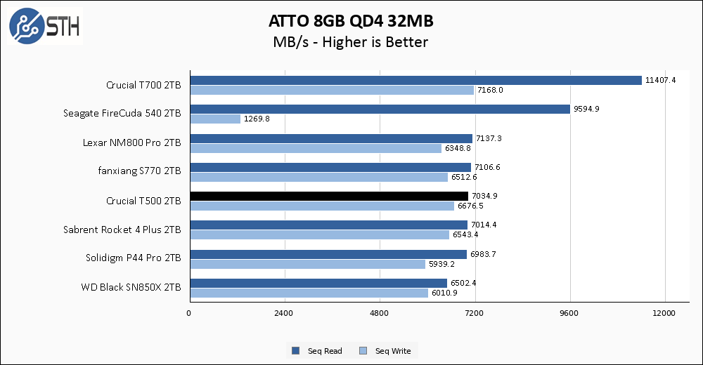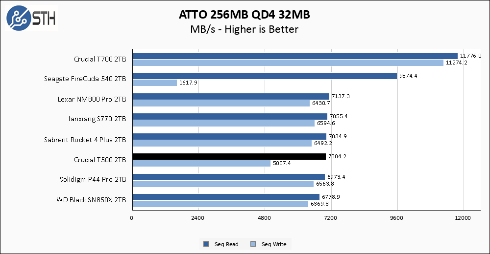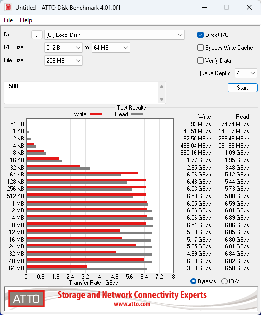 The larger ATTO test has the T500 turn in a better showing than the smaller test, but if you look at the complete results there is still some variability and run-to-run variance in the benchmark results. This is not unusual, but it is something to note.