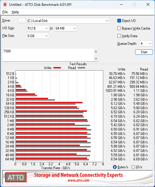 ATTO results tend to be significantly more variable than CrystalDiskMark, and the T500 shows that to some small degree. ATTO also tends to come in slightly slower than CrystalDiskMark and that has held here for essentially all our drives. A small dip in write speed is a bigger indication of some minor performance variability than it is any actual problem.