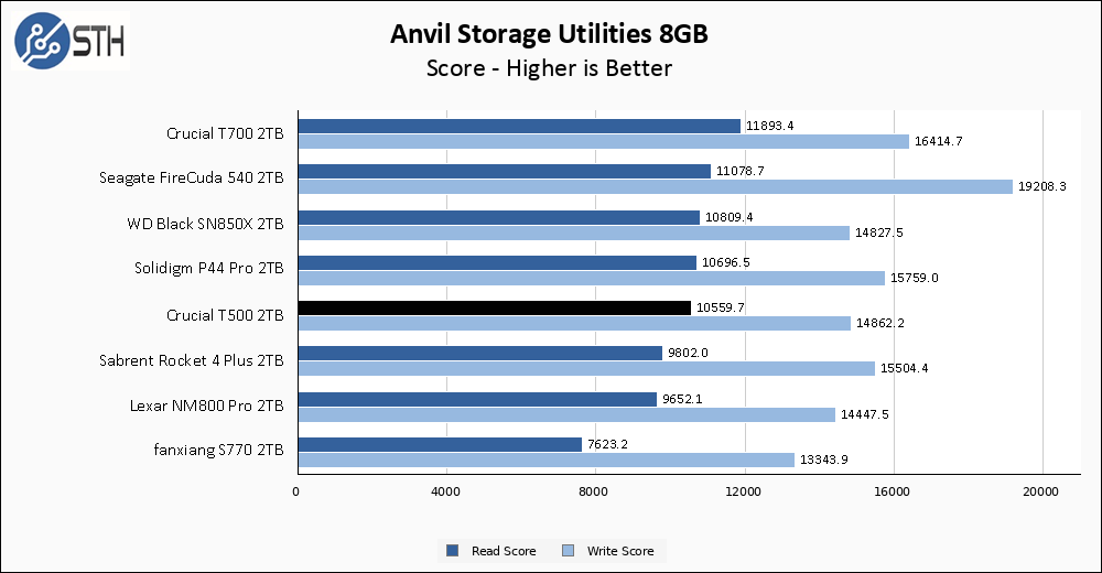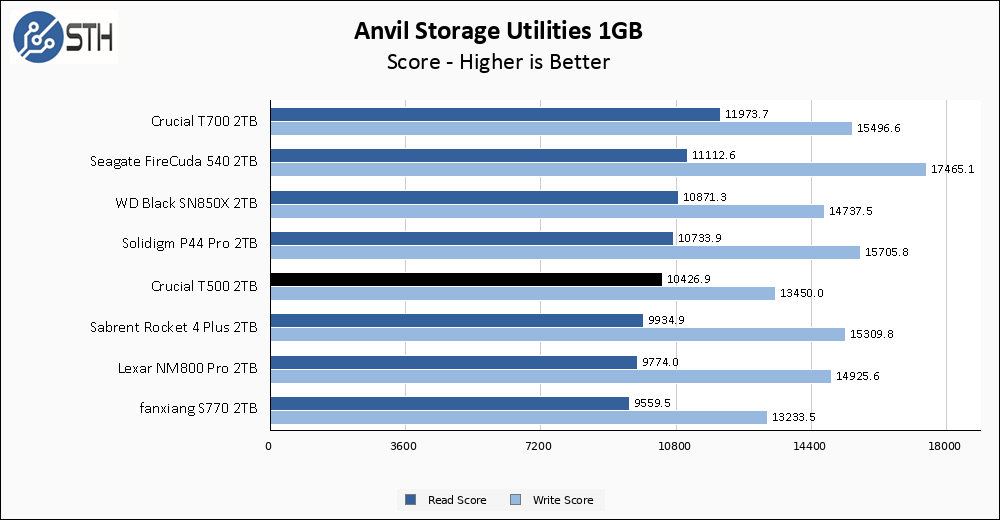 The Anvil results for the Crucial T500 are good, but not quite top of the charts. The WD SN850X turns in a bit higher read score, while several drives like the P44 Pro have a lead on the T500 for write score.