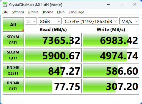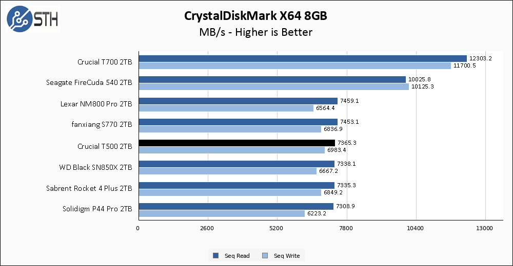The larger CrystalDiskMark test shows the Crucial T500 sticking to its rated performance and thus is essentially class-leading among Gen4 drives.