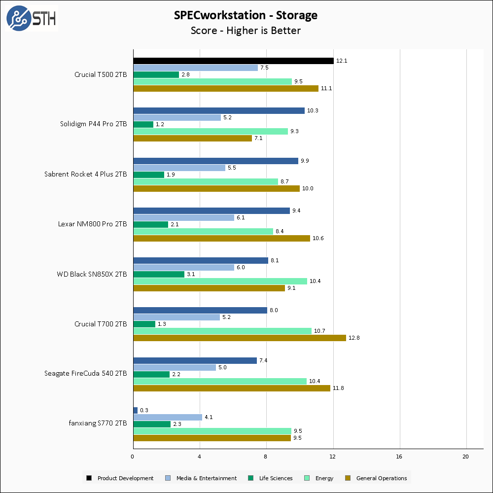We sort SPECworkstation by the Product Development score, and the T500 overperforms here by a huge margin. The T500 also wins the Media category, and turns in strong but not chart-topping performance in the other three. In sum, the T500 is stellar in SPECworkstation.