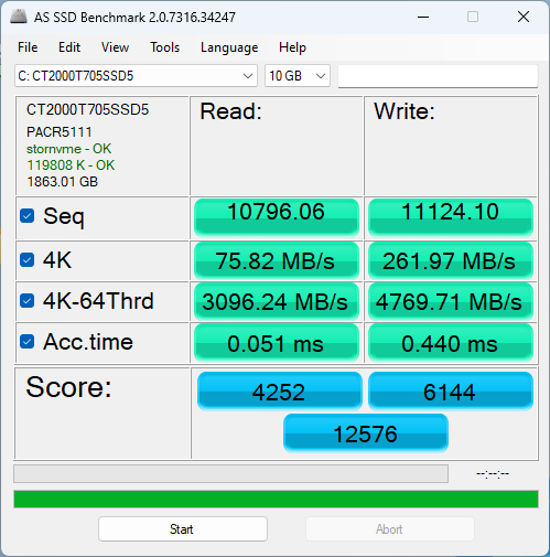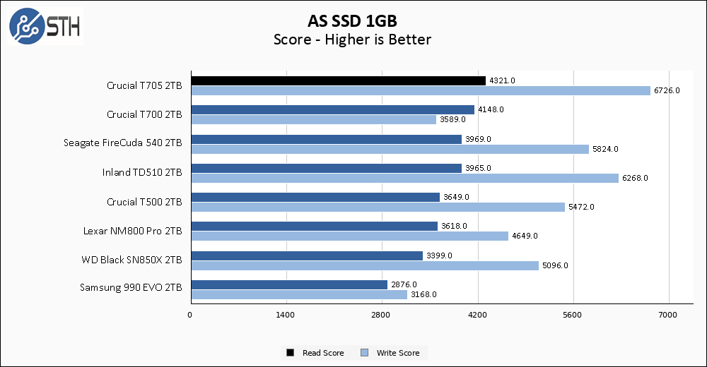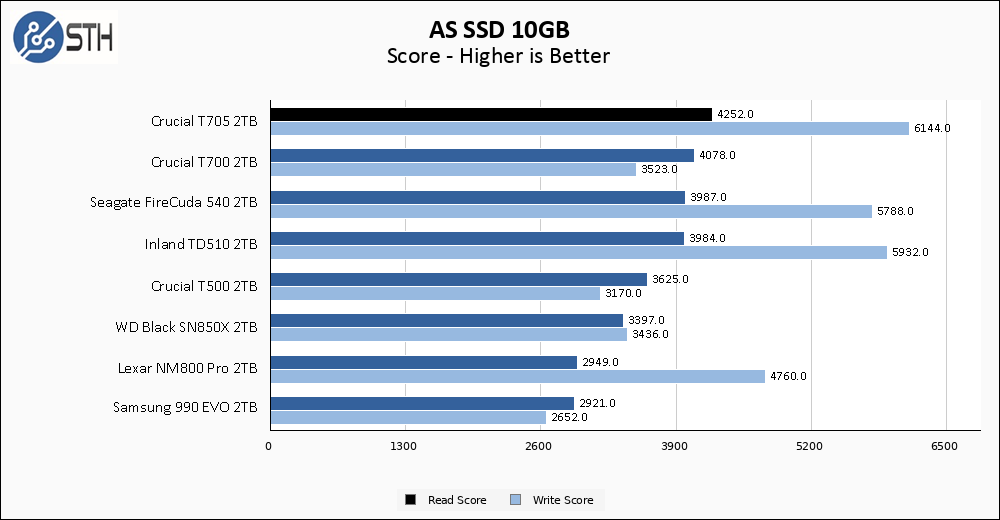 Crucial T705 performance is excellent in AS SSD, setting both a read score and write score record for traditional SSDs. The only caveat is that the margin of victory is somewhat closer in AS SSD, but that seems like a small complaint to me.