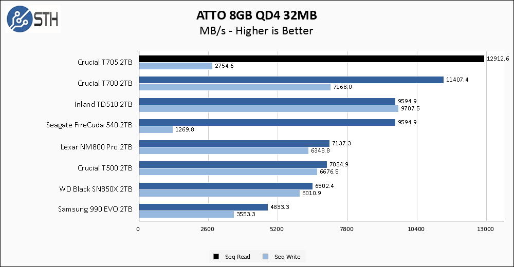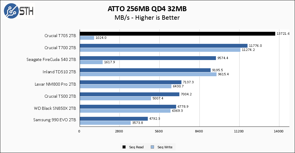 Things do not change on the larger ATTO test. The T705 continues dominating read performance, while write performance is still highly variable across the test.