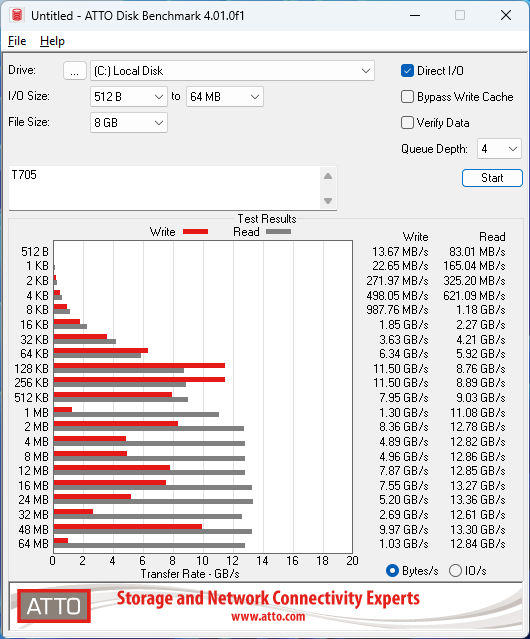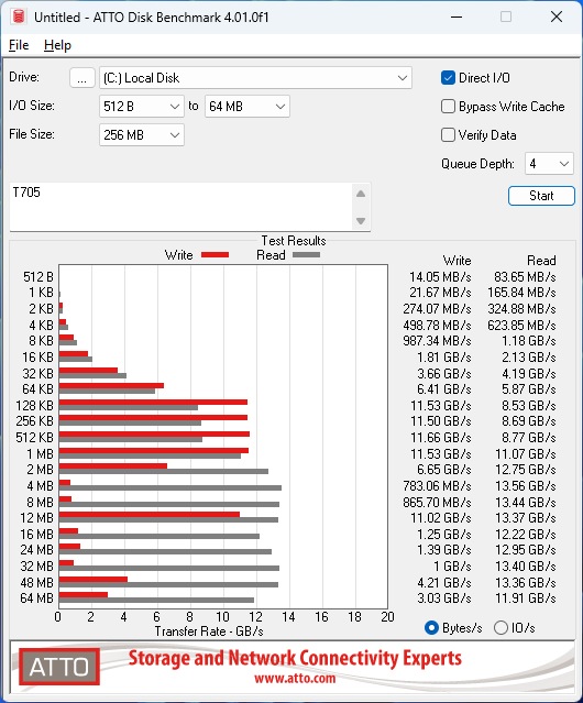 ATTO is a bit of a roller coaster on the T705. On the one hand, we have the highest sequential read results I have ever seen. On the other hand, write results are all over the place. This is behavior I have seen before, though, on Phison E26-powered drives in particular. Running this benchmark with the drive at 0% capacity used would result in a significant improvement in ATTO write speeds, but that is not how I test drives. The exact numbers are not the important part here; looking at the performance instability of the T705 across the length of this benchmark is the more important result.