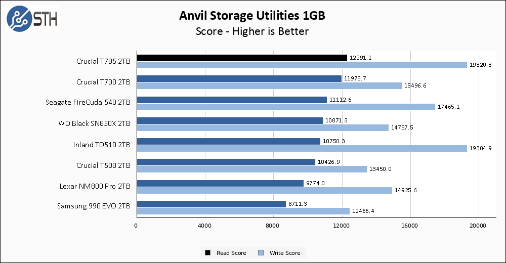 The Anvil results for the Crucial T705 are a return to top form. The read score for the T705 is the highest I have ever seen, excluding the Optane P5800X. Write score sets a record as well, narrowly edging out the TD510.