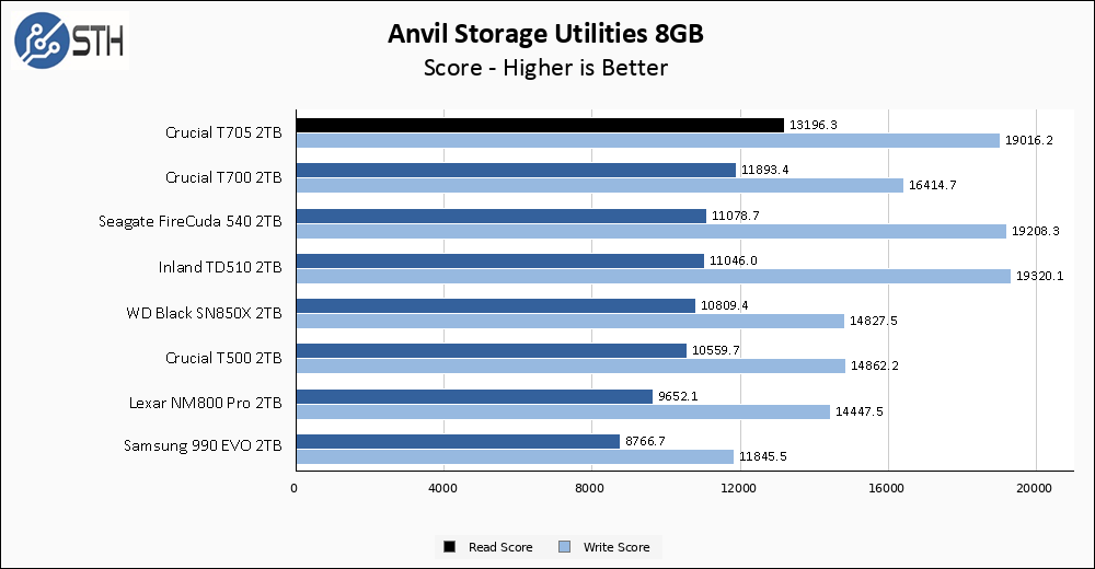 The larger Anvil test shows the T705 holds the top spot for read score I have ever seen, with the only exception being the Optane drive. On the write side, the T705 is narrowly edged out by both the TD510 and the FireCuda 540.