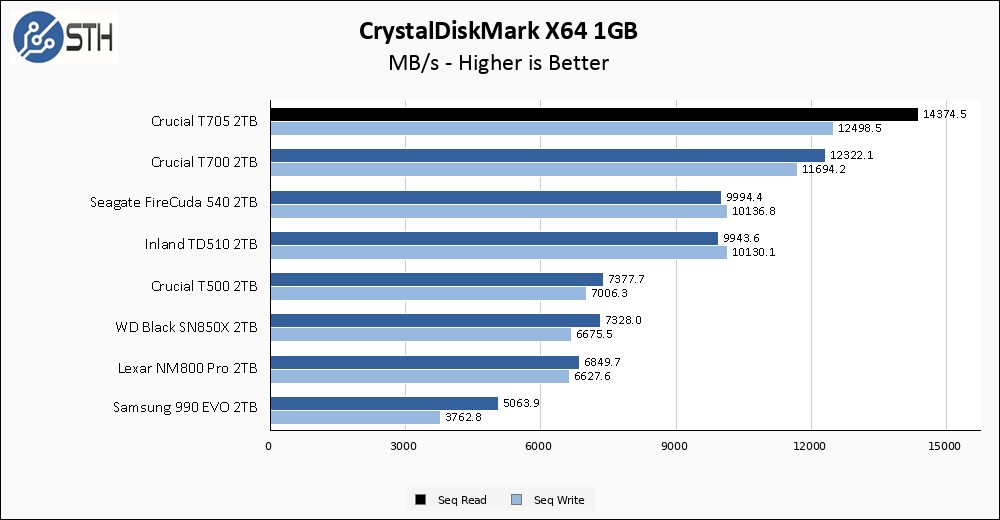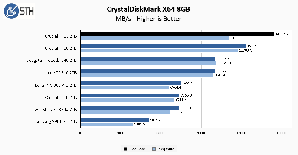 The Crucial T705 holds its read performance steady, though sequential write speed takes a small dip on the larger CrystalDiskMark test. Performance here is still good overall, of course. You should get used to seeing the T705 bar at the top of our charts. It is going to be a recurring theme in this review.
