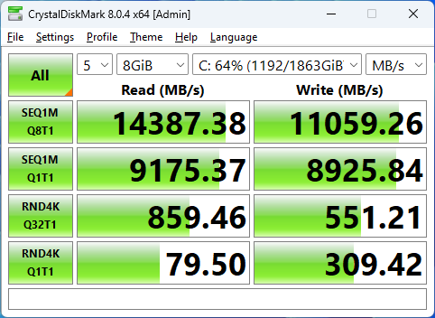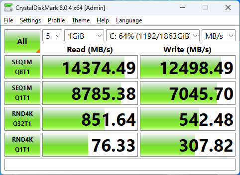The T705 promised 14500 MB/s read and 12700 MB/s write, and it gets darn close to both of those numbers. The results here top my chart, turning in the best sequential read and write performance that I have yet seen. Of course, this is essentially to be expected, as the T705 has the highest-rated specs of any drive I have seen. There is a clear gap between the T700 and the T705, which is what you would want to see with a new drive like this.