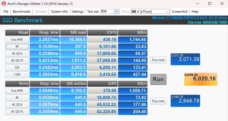 Anvil’s Storage Utilities is a comprehensive benchmark that gives us a very in-depth look at the performance of the drives tested. This benchmark was run with both a 1GB and 8GB test size. Here is the 1GB result: