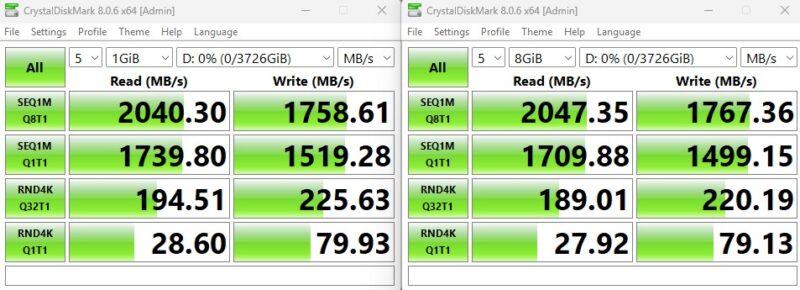 CrystalDiskMark is used as a basic starting point for benchmarks as it is something commonly run by end-users as a sanity check. We use both 1GB and 8GB test sizes.