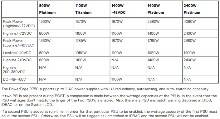 Dell has a number of versions including even DC options. What is a little perplexing is how many of these options are lower-power. With four modern GPUs and one would assume midrange or higher CPUs as one uses in GPU servers, 1.4kW is not enough power to keep the system running on a single power input required to maintain redundancy.