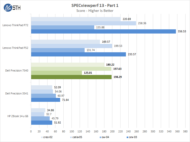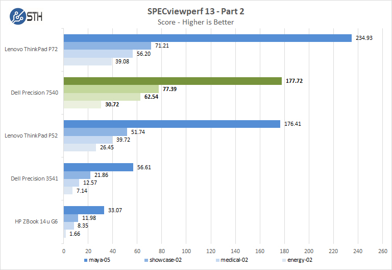 In several key areas, we find the Dell Precision 7540 Mobile Workstation competes very well. The SPECworkstation benchmark takes a great deal of time to run, thermals can have a big effect here, generally, the hardware combination is well balanced which helps generate excellent scores. These are strong scores for SPECworkstation, the cooling system on the Dell Precision 7540 Mobile Workstation helps to keep the CPU and GPU from throttling down due to excessive heat.