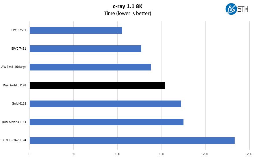 In terms of performance, we see numbers in-line with a single Intel Xeon Gold 6152 which features 22 cores and higher clock speeds. We also see the dual Intel Xeon Gold 5119T in-line with a TDP comparable AMD EPYC 7501 32 core CPU and previous-generation Xeon E5-2628L V4’s.