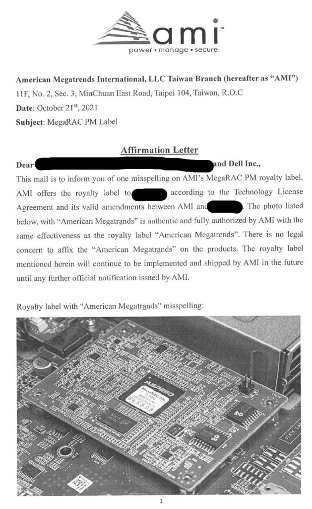 - If either AMI, the ODM, or Dell saw this previously, there was no mention of prior documentation in this. Everyone either missed it until it came up in our review, or nobody cared enough to document it. The unredacted portion of the letter from AMI did not specifically reference some other documentation of this misspelling. If that existed, it would have been explicitly referenced and there would be no need for an “Affirmation Letter” absolving Dell and its customers of legal liability in October 2021.