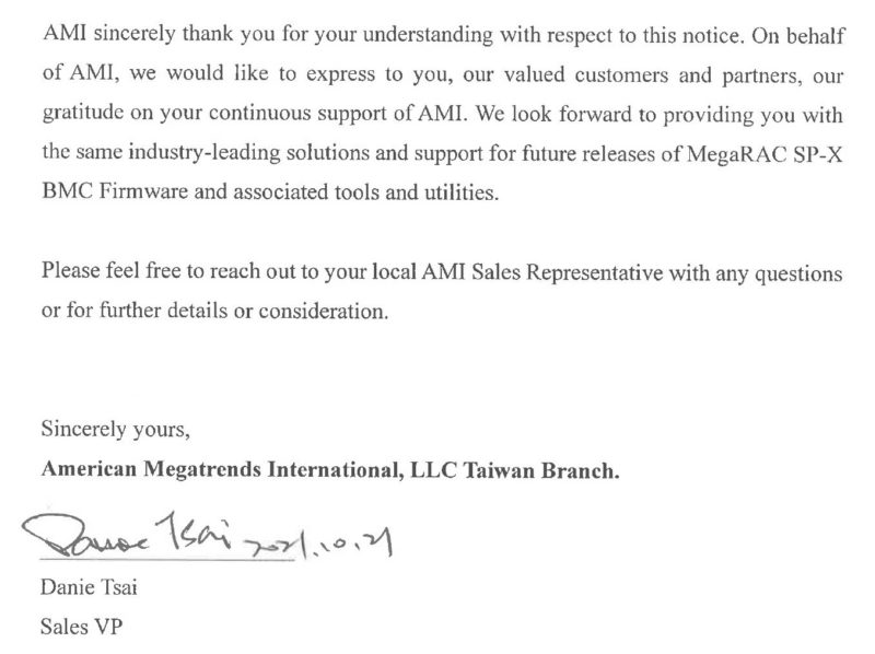 On October 21, 2021, I received this official statement from my American Megatrends US contact in the afternoon: