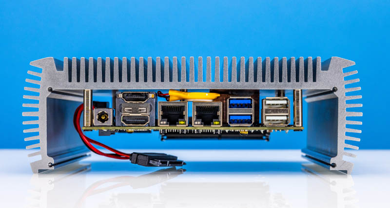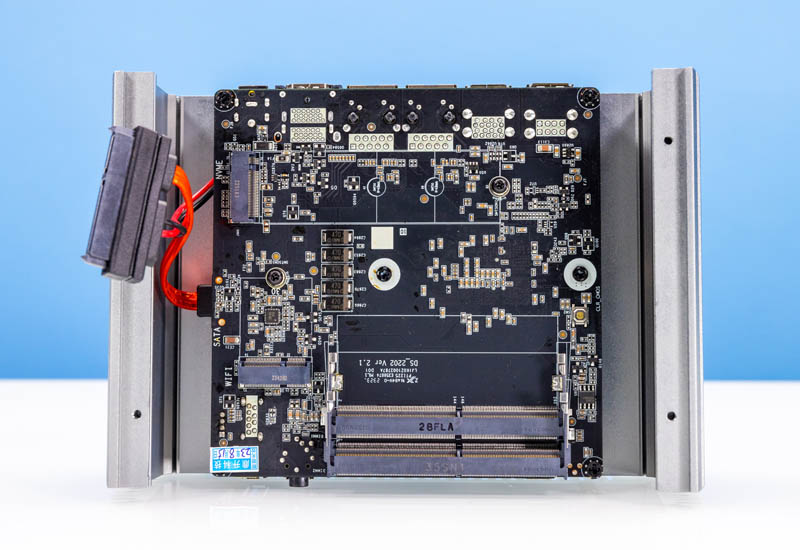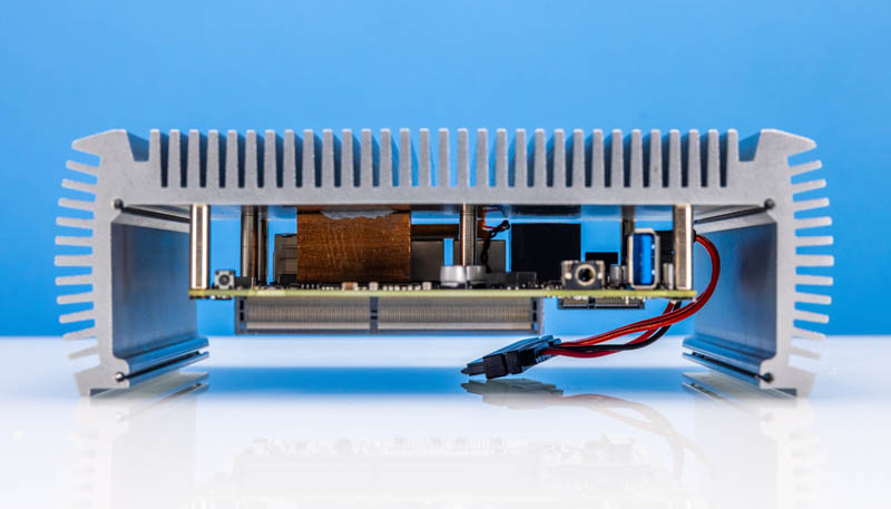 Opening the bottom cover, we see something similar to other fanless systems we have reviewed, with one difference. There is a SATA data and power cable connecting to the SATA port on the other side. One can mount a 2.5″ drive on the bottom cover as an option, but we generally do not do this.