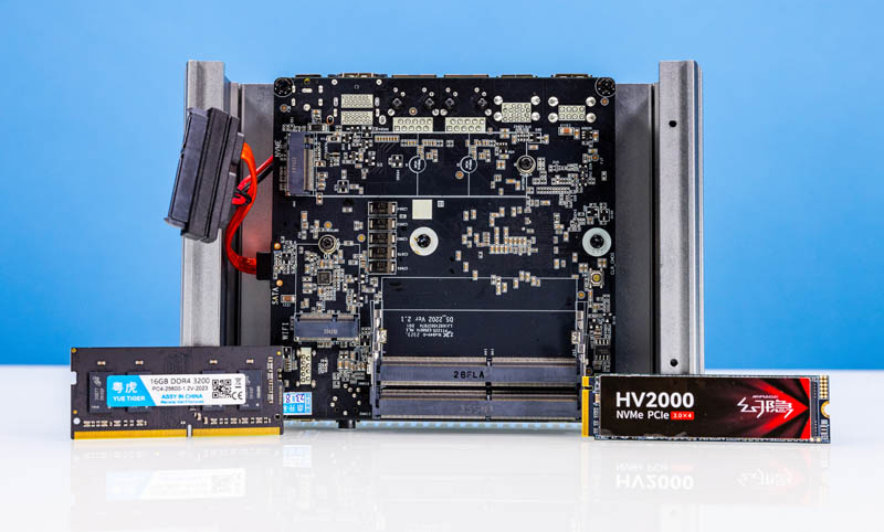 Inside the system, we get Yue Tiger DDR4-3200 memory. A 16GB SODIMM is all the system has, but we generally prefer running two SODIMMs in these systems. There is also a NVMe SSD which was surprising, and we will go into more in our performance section.