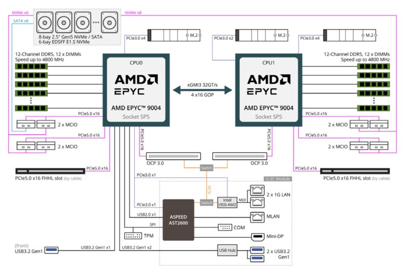 Another feature worth noting is that Gigabyte is using a full 4×16 Infinity Fabric link between the sockets. Some servers are only using a 3×16 link. In a 1U form factor, those extra 32 PCIe Gen5 lanes that one gets with the 3×16 link are unlikely to be used due to space constraints, so this is a higher-performance configuration.