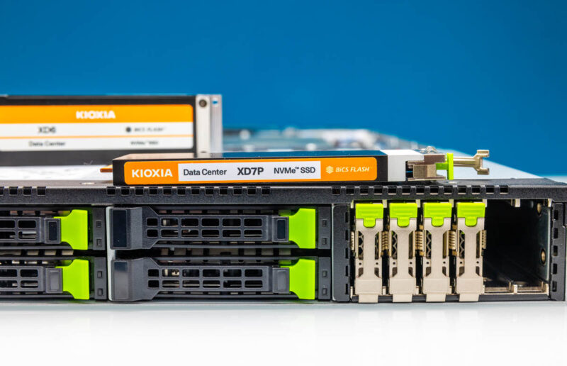 This server is really interesting. It can handle 128 cores per socket or 256 threads making it a fairly dense compute platform. It also skips the capacity 3.5″ storage for extra SSD storage with the E1.S and 2.5″ front storage. It is certainly possible to get denser in 2U 4-node systems for compute and in full E1.S/ E1.L systems, but this is a very dense mix.