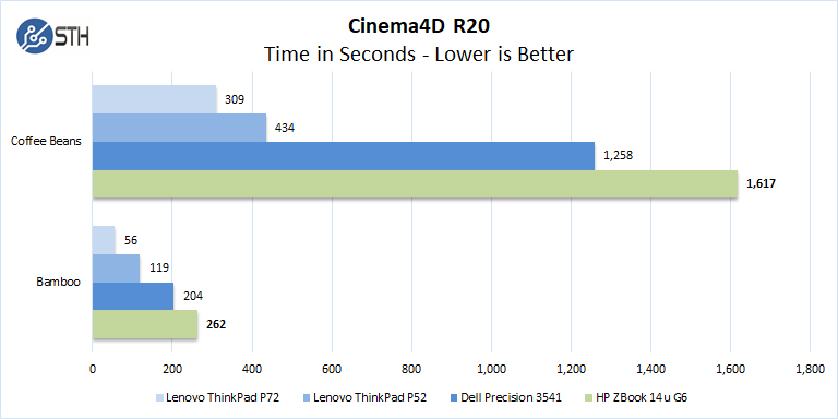 With Cinema4D R20 a strong graphics processing unit is preferred, the AMD Radeon Pro WX3200 struggles with this benchmark.